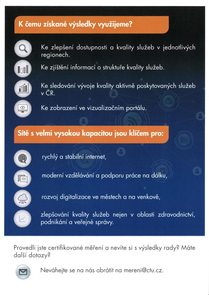 Ve snaze Českého telekomunikačního úřadu podpořit zkvalitnění služby přístupu k síti internet a získat komplexní informace o její dostupnosti a kvalitě v pevném místě napříč Českou republikou, se na Vás obracíme se žádostí o zapojení Vaší obce do kampaně „Ověřte kvalitu pevného internetu“. Cílem je získaná data využít k podpoře budoucího rozvoje a také pro mapovou vizualizaci.