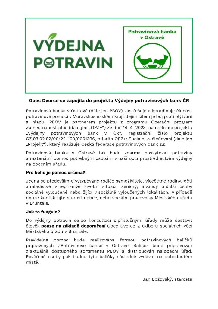 Obec Dvorce se zapojila do vzájemná spolupráce v oblasti distribuce potravinové pomoci nejchudším lidem naší společnosti.