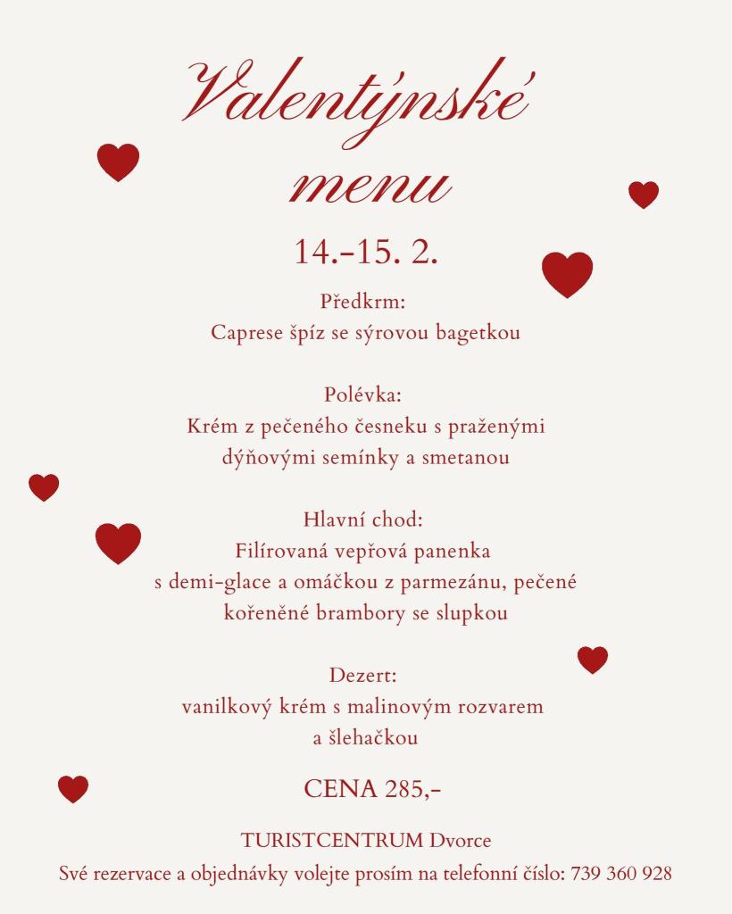 Užijte si s partnerem Valentýnské menu v TURISTCENTRU Dvorce. Podrobnosti v letáku.