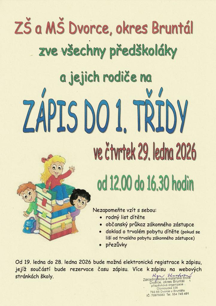 Základní škola ve Dvorcích zve všechny předškoláky a rodiče na zápis dětí do 1. třídy.